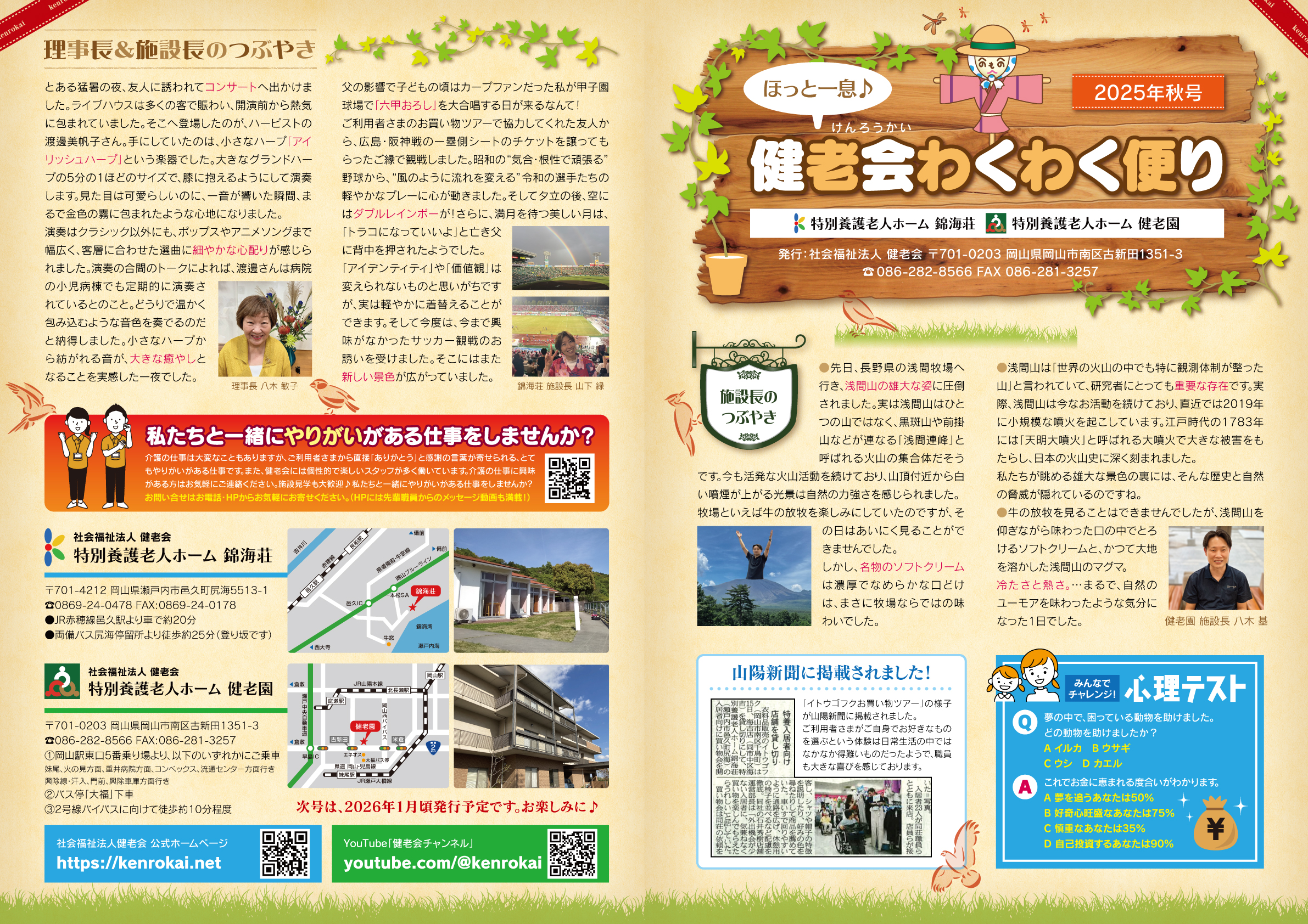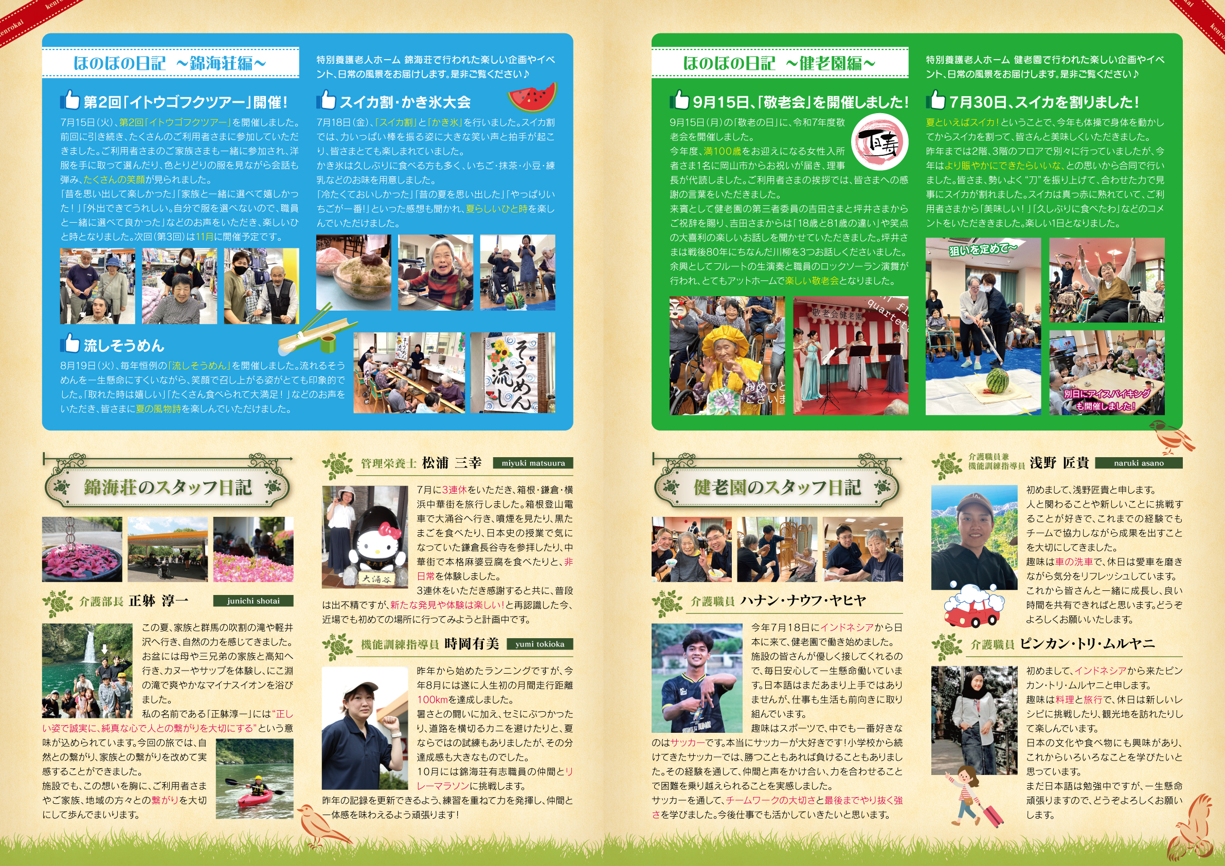 理事長や施設長のつぶやきの他、錦海荘では「イトウゴフクツアー」と「スイカ割り・かき氷大会」「流しそうめん」を、健老園では「敬老会」「スイカ割り」などの様子をお伝えしています。