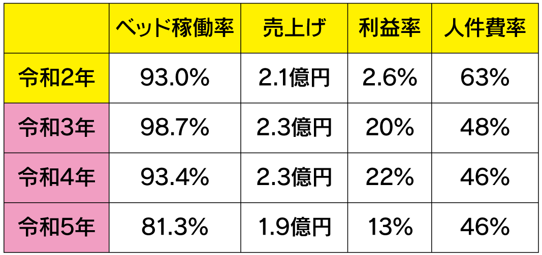 特別養護老人ホーム 錦海荘では、数年前から運営改革を行い、2021年から20%以上の利益率を実現しています。中小企業の営業利益率の全国平均が「3.2%」ですから、いかに高い利益率であるかをご理解いただけると思います。